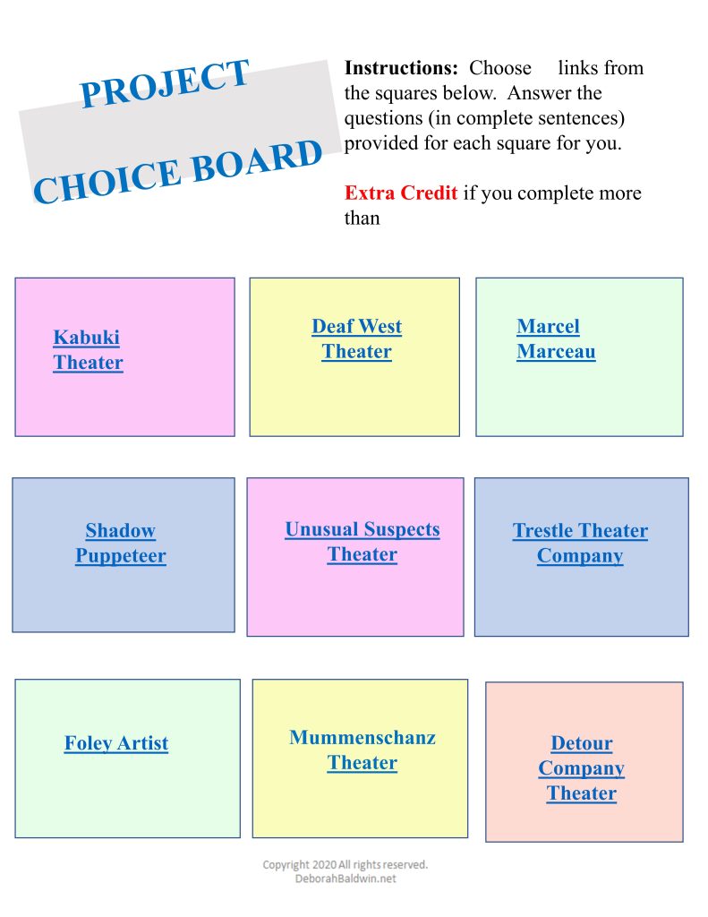 I have three choice board resources ready for you to use.  One pertains to theaters around the world.  This low prep- high student engagement lesson gives students an opportunity to learn about various theater companies such as Mummenschanz, Deaf West, Trestle Theatre, Kabuki Theater,Marcel Marceau or what is means to be a Foley Engineer. Additionally, they are excellent for gifted learners or students who need independent study or an alternative assignment.