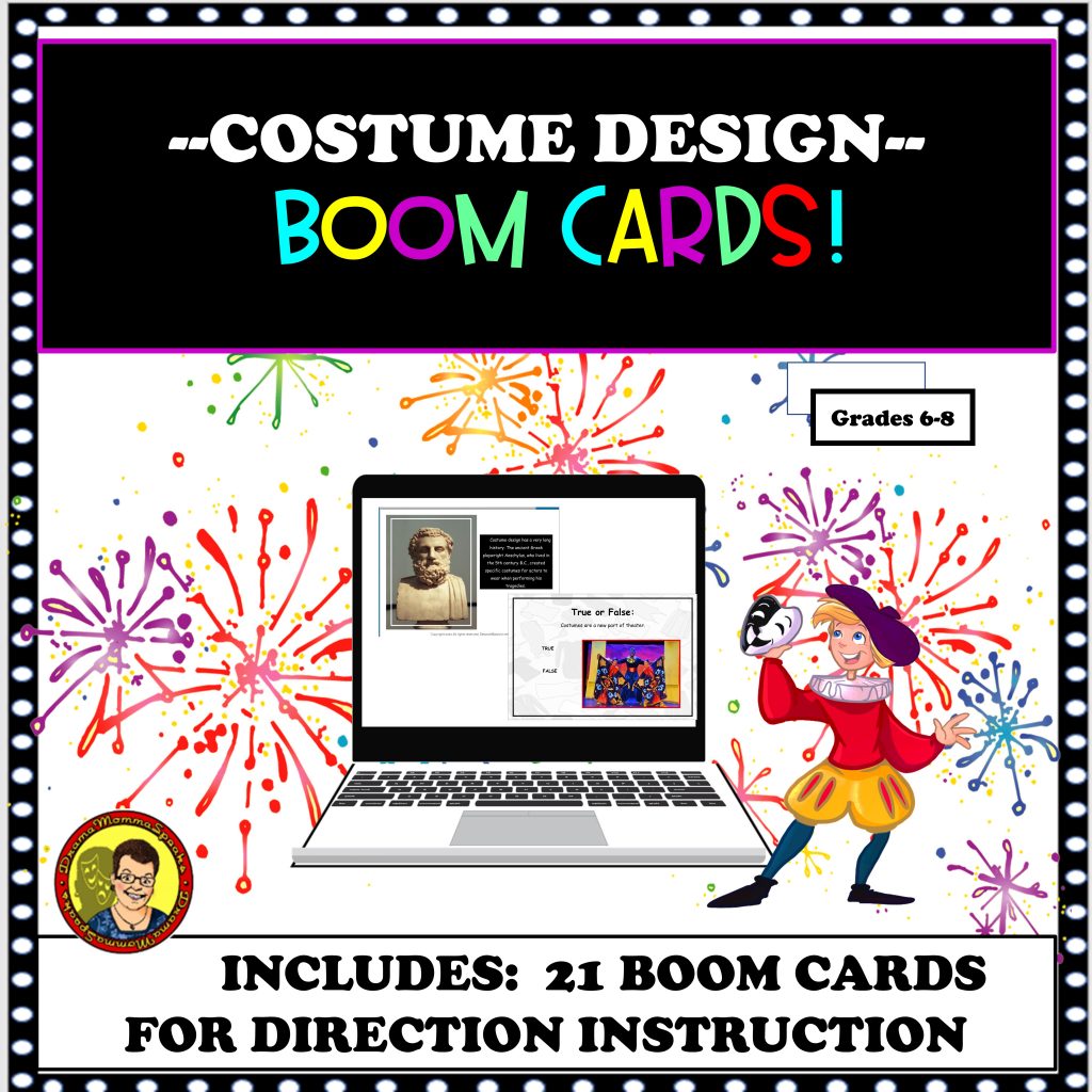 Filed Under: arts education, Boom Cards, Broadway, creative dramatics, Distance Learning, drama education, e-learning, Education, middle grades, reading skills, Teacherspayteachers, youth theatre Tagged With: blended classroom, Boom Cards, costume design, digital task cards, DISTANCE LEARNING, Drama Lessons for Distance Learning, grade 7, grade 8, Grade6, Halloween Costume Design, History of Set Design, hybrid blended classroom, hybrid drama lessons, Middle Grade Boom Cards, set design